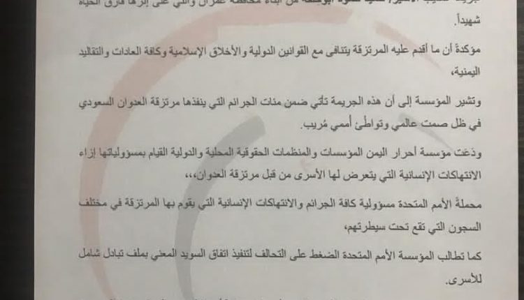 مؤسسة أحرار اليمن تدين جريمة تعذيب الأسير أبو حلقه