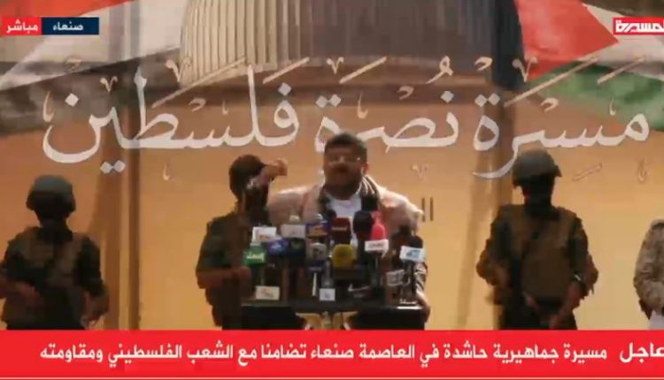 وقال في كلمته أمام الحشود الجماهيرية المناصرة لأبناء فلسطين بصنعاء: نحن نعلن إيقاف جميع الجبهات ولن نحرك ساكنا فيها على أن توجهوا أسلحتكم وطائراتكم وجيوشكم نحو تحرير فلسطين المحتلة ونحن جاهزون لمساندتكم بصواريخنا وطائراتنا المسيرة.