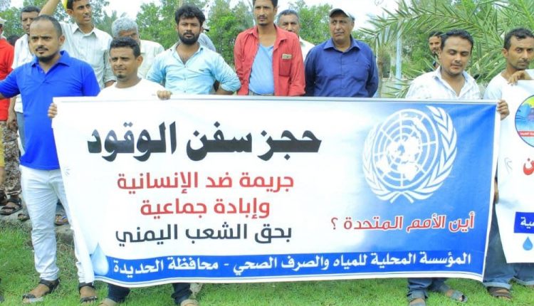 وقفة احتجاجية للسلطة المحلية والقطاعات الخدمية بمحافظة الحديدة تنديدا باحتجاز سفن المشتقات النفطية