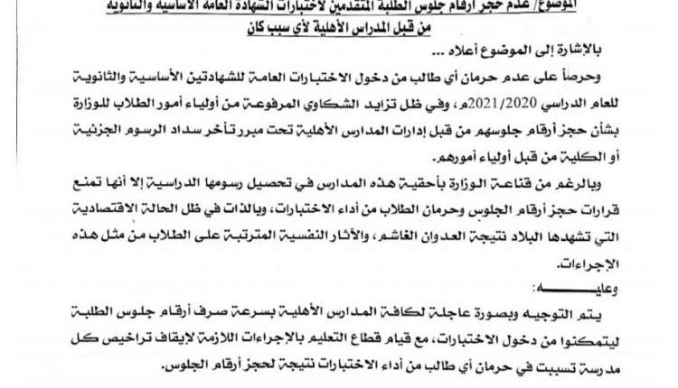 اصدرت وزارة التربية والتعليم تعميما وزاريا جديدا بخصوص ارقام جلوس الطلبة المتقدمين لاختبارات الشهادة العامة الاساسية والثانوية وقيام المدارس الاهلية باحتجازها تحت مبرر الرسوم.