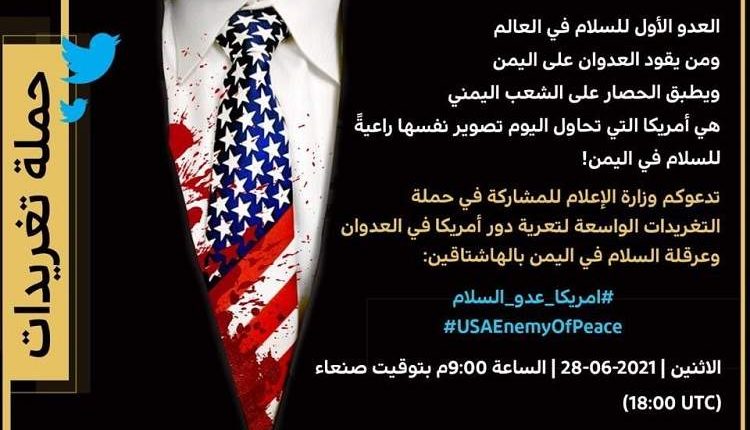 دعت وزارة الإعلام، إلى المشاركة في حملة التغريدات الواسعة على موقع التواصل الاجتماعي “تويتر”، مساء الإثنين، لتعرية دور أمريكا في العدوان وعرقلة السلام في اليمن.
