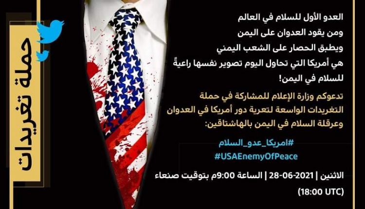 دعت وزارة الإعلام، إلى المشاركة في حملة التغريدات الواسعة على موقع التواصل الاجتماعي “تويتر”، مساء اليوم الإثنين، لتعرية دور أمريكا في العدوان وعرقلة السلام في اليمن.
