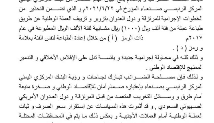 وأكد البيان أن قيام مرتزقة العدوان بتزوير العملة الوطنية يأتي في أطار  الإستهداف الممنهج للاقتصاد الوطني وتدمير العملة.