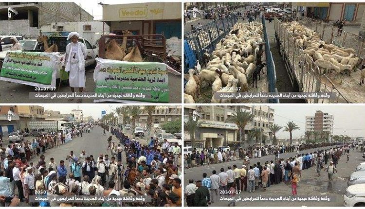 وخلال تسيير القافلة التي تضمنت ألفين و487 رأساً من الأغنام و20 من الأبقار و55 من العجول و17 من الجِمال، نظم أبناء مدينة الحديدة وقفة حاشدة تدشينا ليوم الولاية، وإعلانا للنفير العام، ورفدا للجبهات بالمال والرجال.