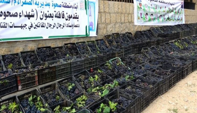 قدّم أبناء منطقة صحوة في دماج بمديرية الصفراء محافظة صعدة اليوم قافلة من العنب بعنوان (شهداء صحوة) دعماً واسنادا للمرابطين في الجبهات من الجيش اليمني المسنود بالشعب.