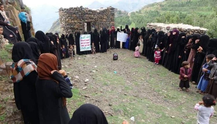 نظمت الهيئة النسائية العامة بعزلة الأحبوب في مديرية الحيمة الداخلية بمحافظة صنعاء، اليوم السبت، وقفة احتجاجية غاضبة تنديدا بالإساءة لنساء اليمن.