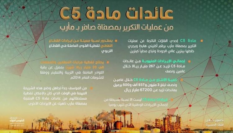 وبين أن مادة C5 إحدى الغازات الناتجة عن عمليات التكرير بمصفاة مأرب برقم أُكتيني هابط ويجري خلطها ببنزين عالي الجودة وتباع محليا كبنزين.