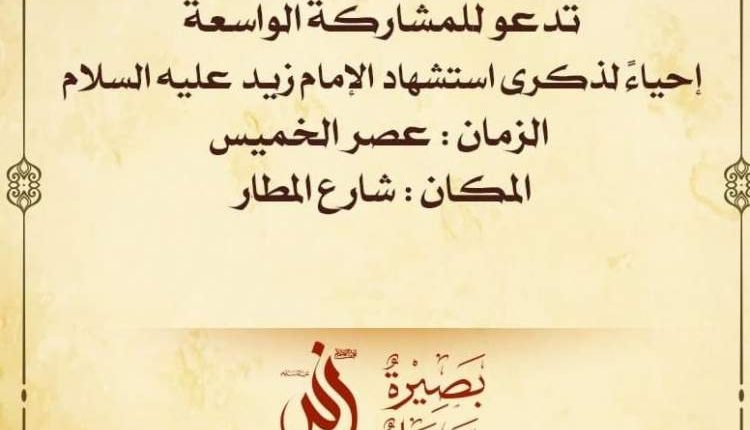 دعت اللجنة المنظمة للفعاليات بأمانة العاصمة للمشاركة الواسعة في مسيرة ذكرى الإمام زيد عليه السلام عصر الخميس في شارع المطار .