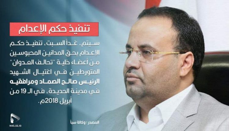 قال مصدر قضائي إنه سيتم، غدا السبت، تنفيذ حكم الإعدام بحق المدانين المحبوسين من أعضاء خلية “تحالف العدوان”، المتورطين في اغتيال الرئيس الشهيد صالح علي الصماد ومرافقيه في مدينة الحديدة، في الـ 19 من أبريل 2018م.