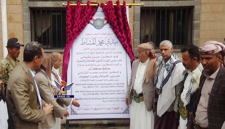 افتتح محافظ إب عبدالواحد صلاح، ونائب وزير الاتصالات وتقنية المعلومات – رئيس مجلس إدارة المؤسسة العامة للاتصالات الدكتور هاشم الشامي اليوم، 76 مشروعا في قطاع الاتصالات بالمحافظة بتكلفة مليار و700 مليون ريال بمناسبة العيد السابع لثورة 21 سبتمبر المجيدة.