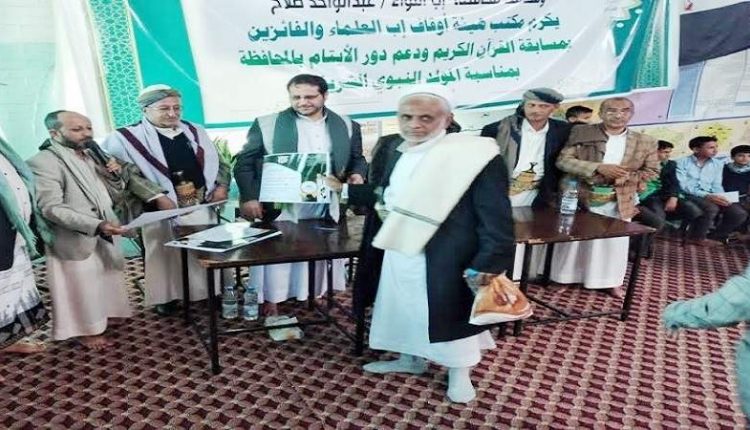 نظّم مكتب الهيئة العامة للأوقاف في محافظة إب، اليوم الاثنين، حفلاً تكريمياً للعلماء والفائزين بمسابقة القرآن الكريم، ودعم دُور الأيتام في المحافظة بمناسبة ذكرى المولد النبوي الشريف.