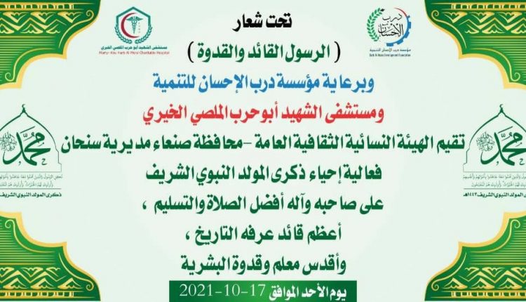 برعاية مؤسسة درب الإحسان للتنمية ومستشفى الشهيد أبو حرب الملصي الخيري أقامت الهيئة النسائية الثقافية العامة بمديرية سنحان في محافظة صنعاء فعالية ثقافية تحت شعار ” الرسول القائد والقدوة” إحياء لذكرى المولد النبوي الشريف على صاحبه أفضل الصلاة واتم التسليم.