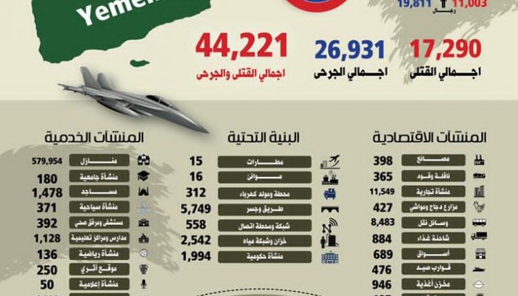 وأضاف التقرير أن طيران العدوان استهدف 15 مطاراً و16 ميناءً و312 محطة ومولد كهرباء.. كما استهدف العدوان 558 شبكة ومحطة اتصال و2542 خزاناً ومحطة مياه و1994 منشأة حكومية و5749 طريقاً وجسراً.