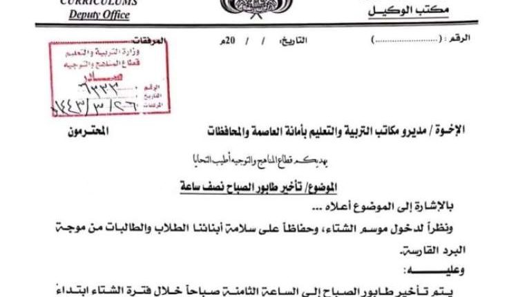 أصدرت وزارة التربية والتعليم تعميم لكل مكاتبها بشأن تأخير الطابور الصباحي في المدارس بسبب موجة البرد.