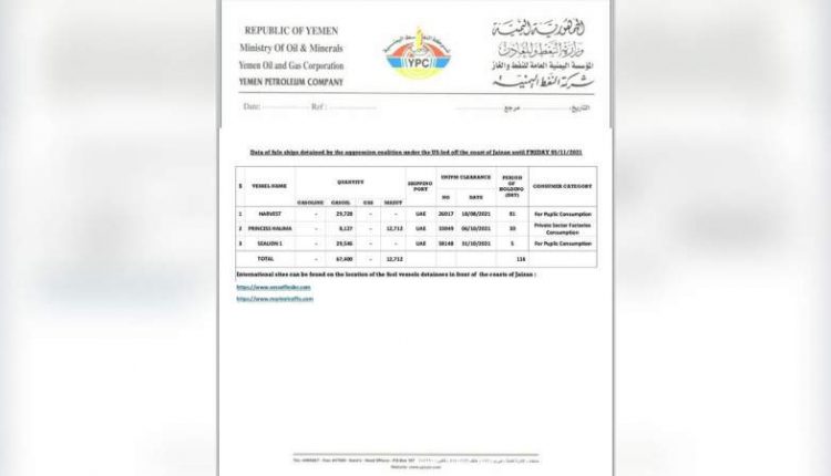 وقالت الشركة في بيان لها لا تزال قوات العدوان الأمريكية – السعودية تحتفظ ب 3 سفينة نفط وبلغت (80,112) طن من المازوت والمازوت ولمدة متفاوتة كان لها شهرين (81 يوما) من القرصنة البحرية غير المسبوقة على سفن النفط”.