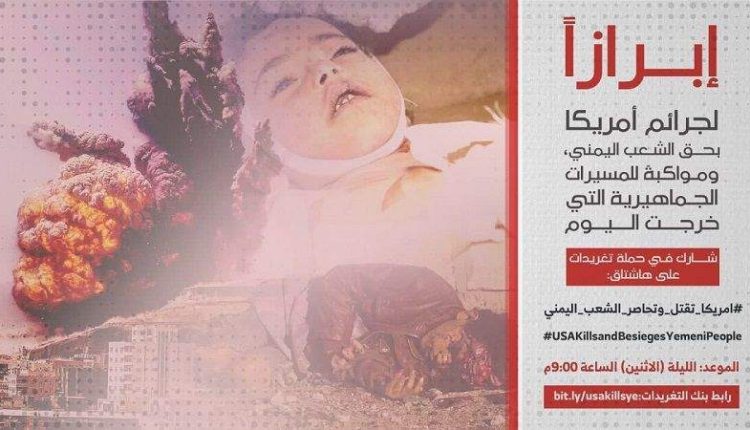 حملة تغريدات بعد أقل من ساعة لإبراز جرائم أمريكا بحق الشعب اليمني