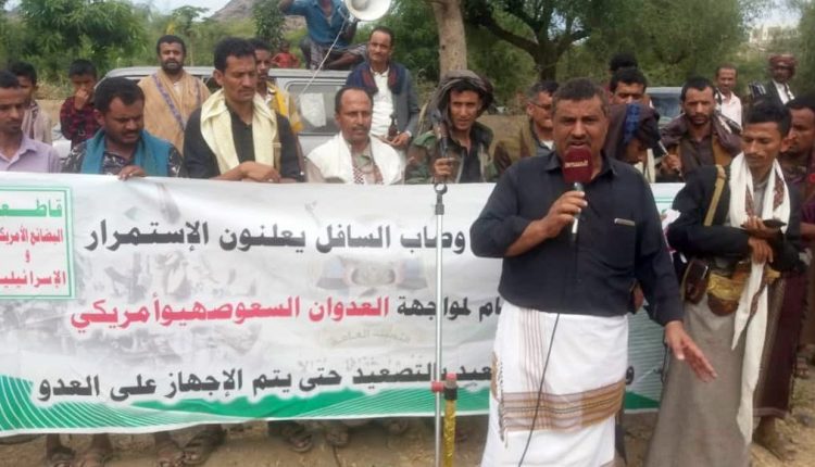 وأُلقيت خلال الوقفة التي شارك فيها عدد من أعضاء المكتب التنفيذي والإشرافي بالمديرية، قصائد شعرية عبرت عن الإدانة لجرائم والعدوان والتأكيد على الاستمرار في رفد الجبهات.