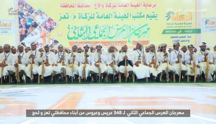 احتفى 348 عريساً وعروساً من أبناء محافظتي تعز ولحج، اليوم السبت، بإكمال نصف دينهم، في عرس جماعي نظّمه مكتب الهيئة العامة للزكاة بمحافظة تعز.