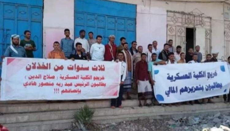 وطالب الخريجون العسكريون حكومةَ الفنادق بتصحيح أوضاعهم ورفع الظلم عنهم ومنحهم حقوقَهم المنهوبة والمسلوبة عقب ثلاث سنوات من الخذلان والحرمان، محملين حكومة المرتزِق معين عبدالملك مسؤولية نهب رواتبهم.