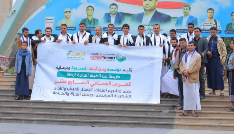 نظمت مؤسسة يمن ثبات التنموية بأمانة العاصمة صنعاء، اليوم العرس الجماعي السابع عشر لـ ١٣ من المرابطين في الجبهات، بدعم من الهيئة العامة للزكاة ضمن مشروع العفاف.