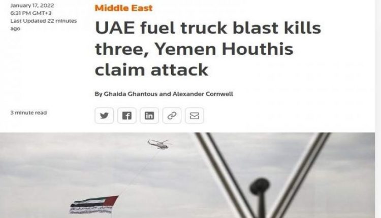 وكما نقلت وكالة رويترز عن “أدنوك” الإماراتية تأكيدها وقوع حادث في مستودع وقود المصفح في أبوظبي صباح اليوم الاثنين نتج عنه حريق.