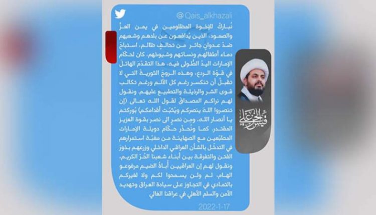 وقال الخزعلي في تغريدة على تويتر، مساء الاثنين: “نبارك للأخوة المظلومين في يمن العز والصمود الذين يدافعون عن بلدهم وشعبهم ضد عدوان جائر من تحالف ظالم استباح دماء أطفالهم ونسائهم وشيوخهم كان لحكام الإمارات اليد الطولى فيه”.