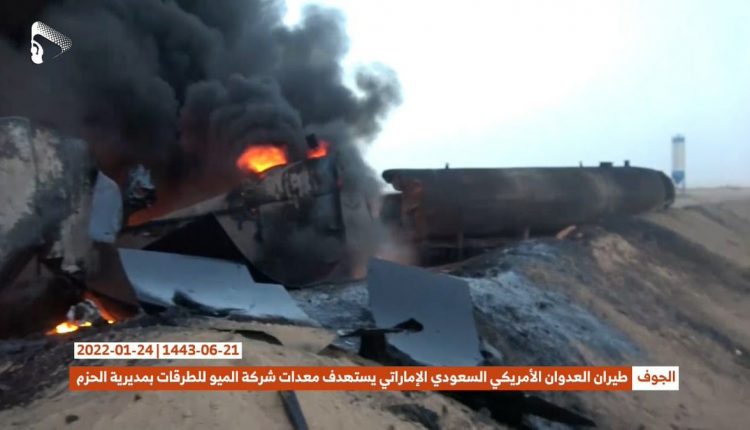 شاهد.. استهداف طيران العدوان لشركة مقاولات في الجوف (فيديو)