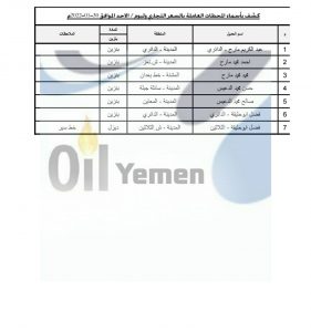 نشرت شركة النفط اليمنية كشوفات بأسماء المحطات التجارية العاملة ليوم غدا الأحد الموافق 30 يناير 2022م ” بنزين” في أمانة العاصمة ومحافظات صنعاء وعمران وحجة والمحويت وذمار والبيضاء والضالع وإب وصعدة .