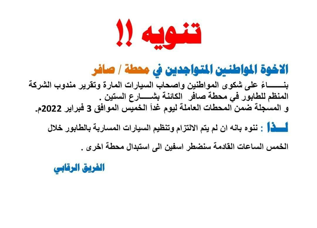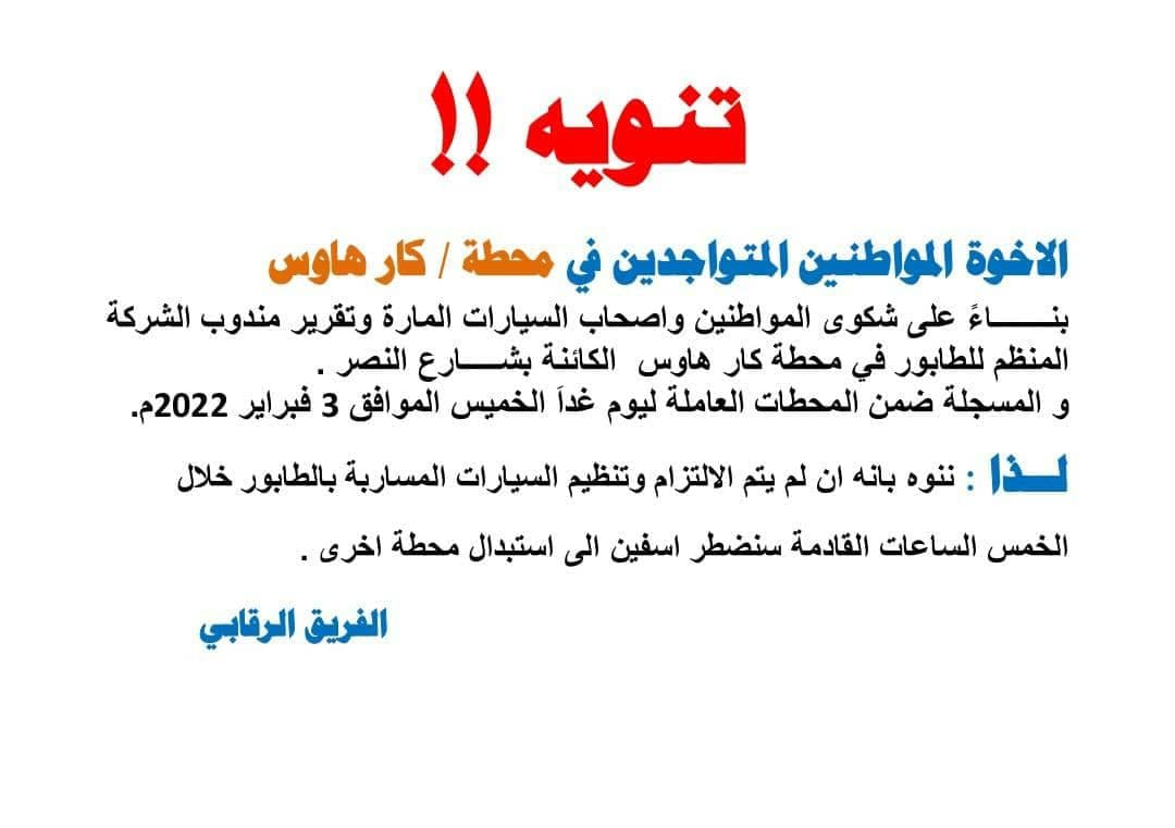 وقالت الشركة في التنويه، إلى المواطنين المتواجدين أمام المحطات العاملة في أمانة العاصمة ليوم الخميس، وهي (محطة #صافر والواقعة بشارع الستين ، ومحطة #كار_هاوس الواقعة في شارع النصر ، ومحطة #سعيد_الهزامي الواقعة في شارع خولان جولة الجوازات)، بأنه إن لم يتم الإلتزام وتنظيم السيارات المساربة بالطوابير خلال الخمس الساعات القادمة سنضطر أسفين إلى إستبدال محطات أخرى.