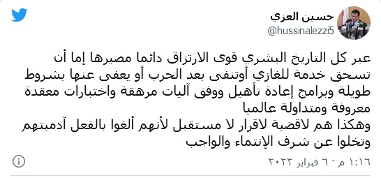 وقال العزي في تغريدة على حسابه بموقع “تويتر” : عبر كل التاريخ البشري قوى الارتزاق دائما مصيرها إما أن تسحق خدمة للغازي أو تنفى بعد الحرب أو يعفى عنها بشروط طويلة وبرامج إعادة تأهيل ووفق آليات مرهقة واختبارات معقدة معروفة ومتداولة عالميا.