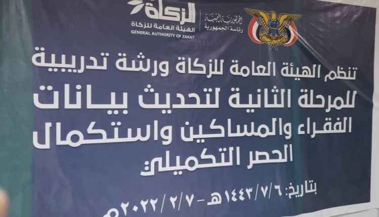 عقدت الهيئة العامة للزكاة اليوم، ورشة عمل تدريبية لتنفيذ المرحلة الثانية من مشروع تحديث واستكمال البيانات والحصر التكميلي للفقراء والمساكين في عموم محافظات الجمهورية.