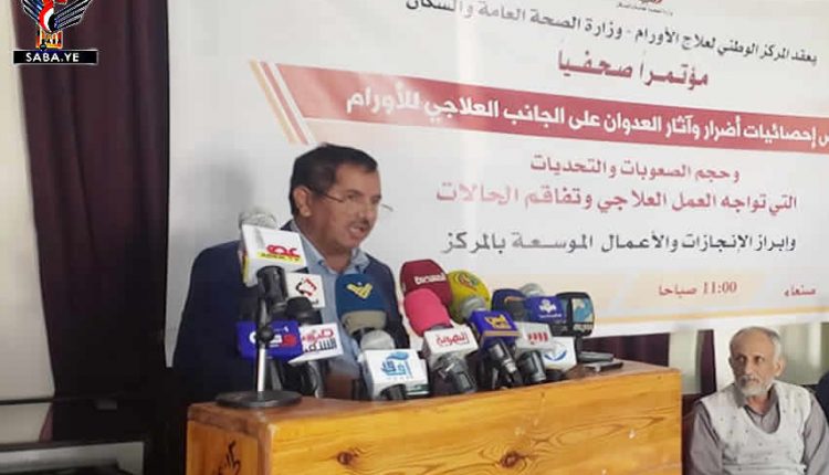 وتطرق الدكتور جحاف في مؤتمر صحفي نظمه المركز الوطني لعلاج الأورام اليوم بصنعاء حول أضرار وآثار العدوان على الجانب العلاجي للأورام وحجم الصعوبات والتحديات التي تواجه العمل، إلى التداعيات الكارثية الناجمة عن إيقاف منظمة الصحة العالمية إدخال أدوية السرطان إلى اليمن بسبب العراقيل التي يضعها تحالف العدوان.
