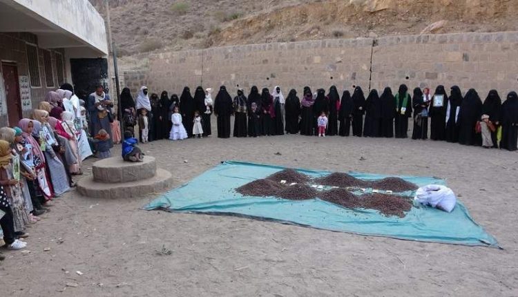 وخلال تسيير القافلة التي تضمنت عشرة أقداح من البُن و400 ألف ريال، نظمت نساء المنطقة وقفة احتجاجية للتنديد بتصعيد العدوان وجرائمه وترويع المدنيين وتشديد الحصار على الشعب اليمني.