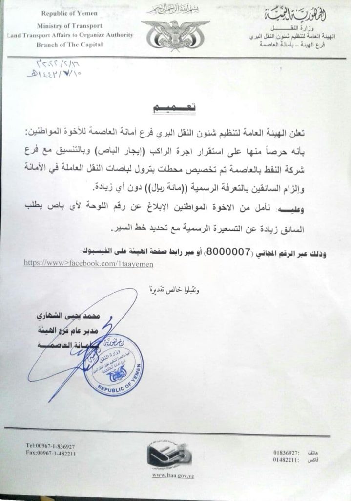 وشدد التعميم على أنه وفي ظل أزمة الوقود التي تشهدها أمانة العاصمة والمحافظات نتيجة استمرار تحالف العدوان باحتجاز سفن الوقود ومنع وصولها إلى ميناء الحديدة وحرصاً من الهيئة على استقرار تعرفة باصات الأجرة وبالتنسيق مع فرع شركة النفط بالعاصمة تم تخصيص محطات بترول لباصات النقل العاملة في الأمانة وإلزام السائقين بالتعرفة الرسمية (مائة ريال) دون زيادة أو نقصان.