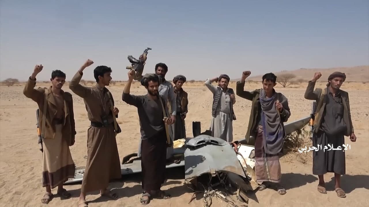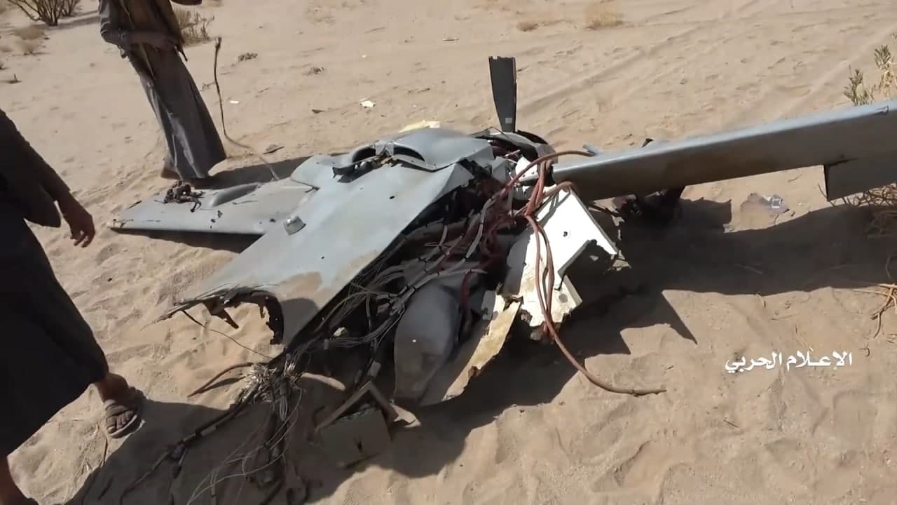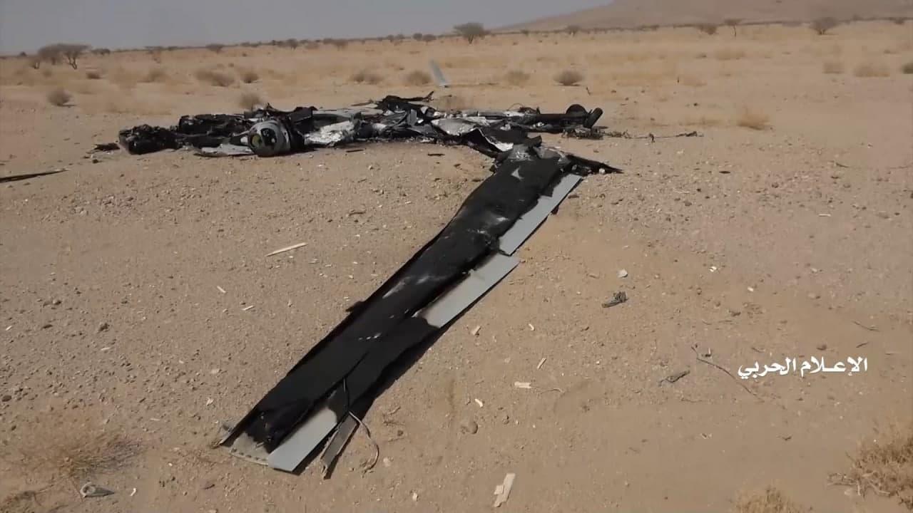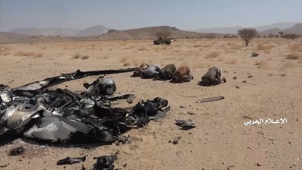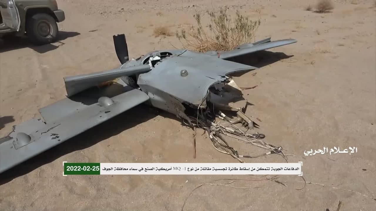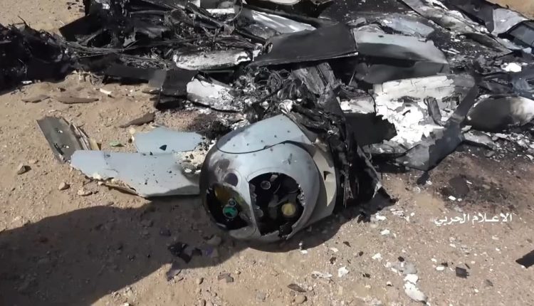 وزع الإعلام الحربي اليمني مشاهد لحطام طائرة إم كيو1 أمريكية الصنع تابعة لسلاح الجو الإماراتي التي اسقطتها الدفاعات الجوية التابعة للجيش واللجان الشعبية يوم الجمعة في أجواء محافظة الجوف.