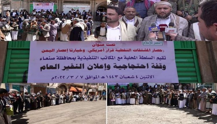 نظم موظفو ديوان ومكاتب محافظة صنعاء، اليوم الإثنين، وقفة احتجاجية للتنديد بحصار العدوان الأمريكي السعودي الإماراتي واستمرار القرصنة البحرية واحتجاز سفن المشتقات النفطية.