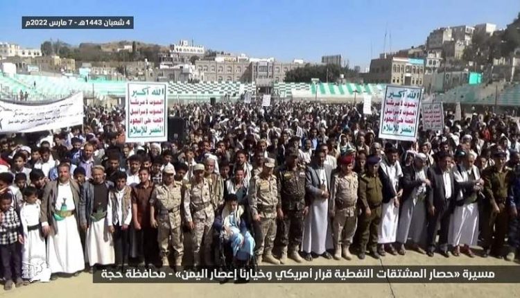 شهدت مدينة حجة اليوم الإثنين، مسيرة حاشدة للتنديد باستمرار احتجاز سفن المشتقات النفطية تحت شعار “حصار المشتقات النفطية قرار أمريكي وخيارنا إعصار اليمن”.