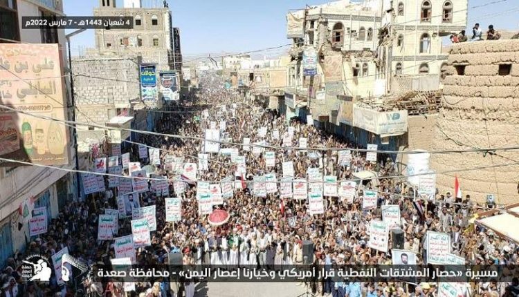 مسيرة جماهيرية حاشدة في صعدة تحمل أمريكا المسؤولية الكاملة عن الحصار ومنع دخول المشتقات النفطية
