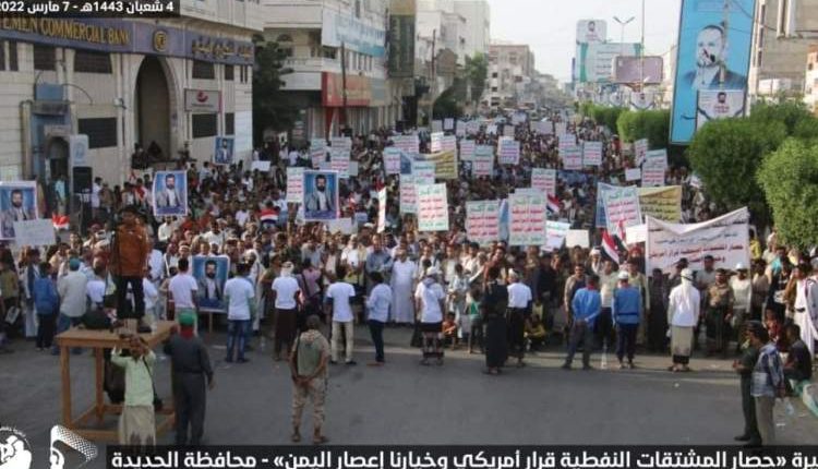 شهدت مدينة الحديدة عصر اليوم الاثنين ، مسيرة جماهيرية في شارع الميناء، تحت شعار “حصار المشتقات النفطية قرار أمريكي، وخيارنا إعصار اليمن”، للتنديد بحصار المشتقات النفطية ومنعها من الدخول لموانئ الحديدة.