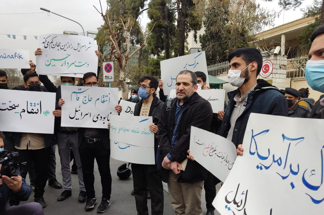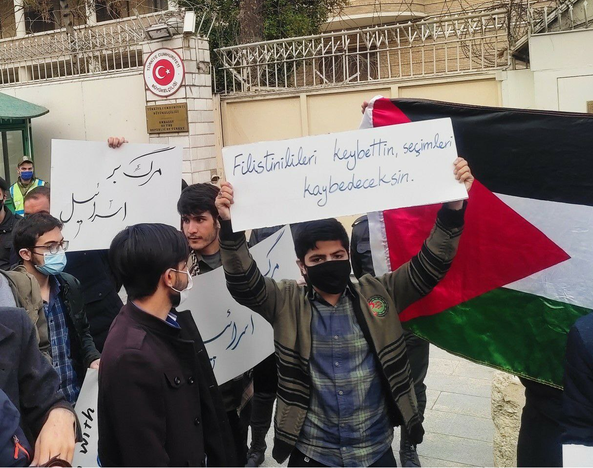 نظم حشد من الطلبة الجامعيين في جامعات طهران تجمعاً أمام السفارة التركية إحتجاجاً على زيارة رئيس الكيان الصهيوني إلى تركيا.