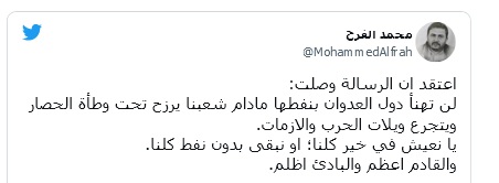 وعلق الفرح في تغريده له على حسابه بموقع “تويتر”، على هجوم القوات المسلحة اليمنية الذي استهدف منشآت آرامكو في العمق السعودي ، قائلاُ : “أعتقد ان الرسالة وصلت لن تهنأ دول العدوان بنفطها مادام شعبنا يرزح تحت وطأة الحصار ويتجرع ويلات الحرب والازمات”.
