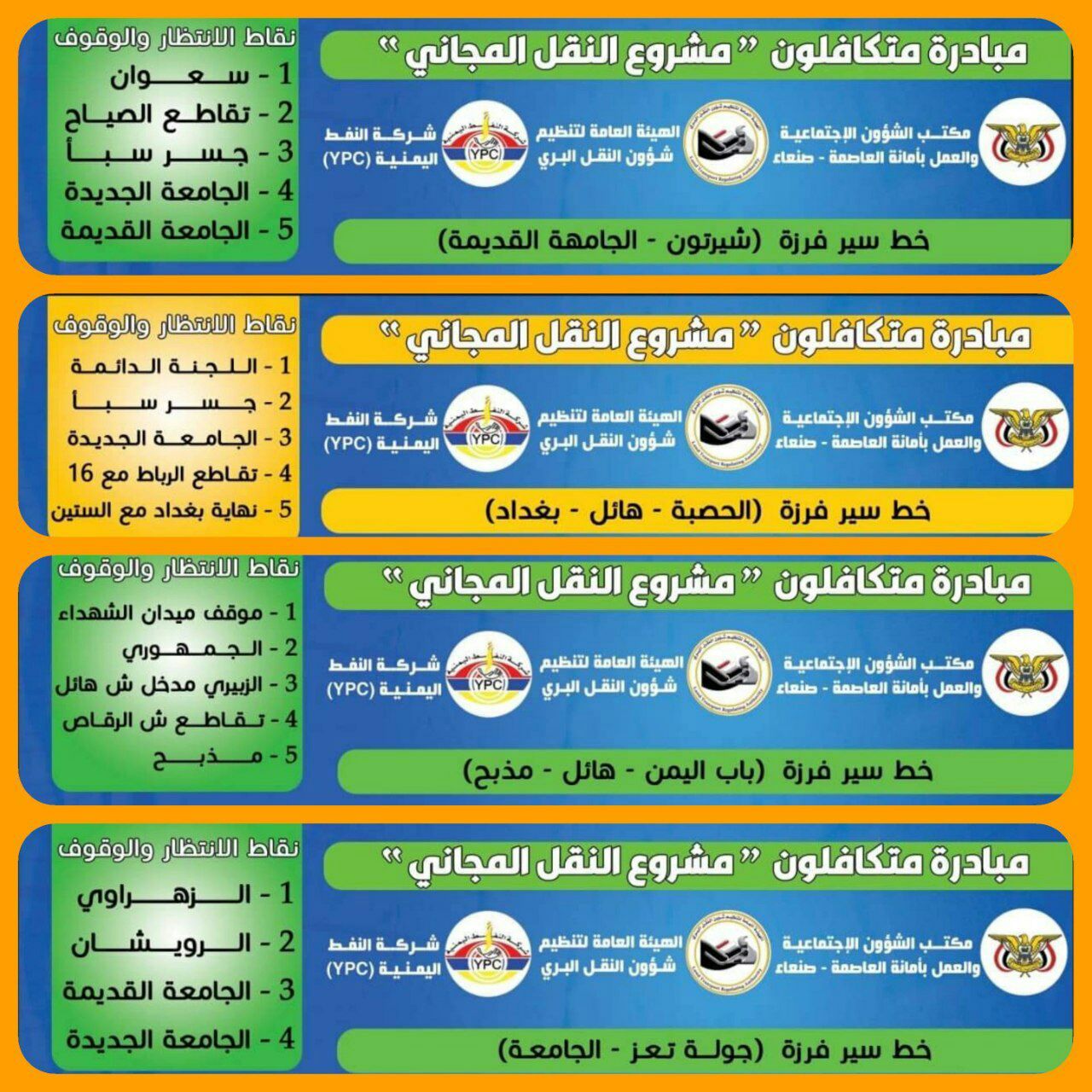أعلنت الهيئة العامة لتنظيم شؤون النقل البري بالتعاون مع مكتب الشؤون الاجتماعية والعمل بأمانة العاصمة وشركة النفط اليمنية، ووزارة الداخليـة، للمواطنين عن تدشين خطوط السير الجديدة للنقل المجاني بأمانة العاصمة بدءً من صباح اليوم الإثنين، ضمن مبادرة “متكافلون” التي تهدف إلى التخفيف من أزمة المشتقات النفطية على المواطنين.