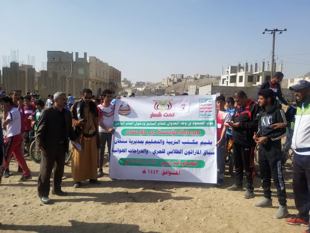 تحت شعار (يوم الصمود في وجه العدوان للعام السابع ودخول العام الثامن) وبرعاية مؤسسة درب الإحسان، نظم مكتب التربية والتعليم بمديرية سنحان في محافظة صنعاء صباح اليوم سباق ماراثون طلابي للجري والدراجات الهوائية وبمشاركة عدد من مدارس المديرية.