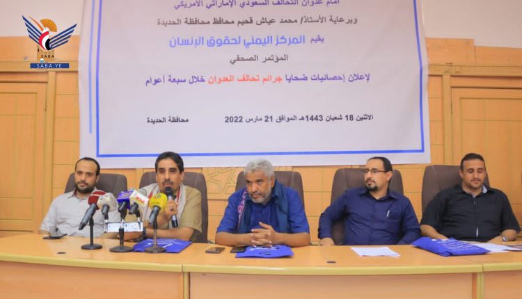 عقد المركز اليمني لحقوق الإنسان، الإثنين، مؤتمراً صحفياً بمحافظة الحديدة لاستعراض إحصائيات ضحايا تحالف العدوان الأمريكي السعودي الإماراتي خلال سبعة أعوام، بالتزامن مع اليوم الوطني للصمود.
