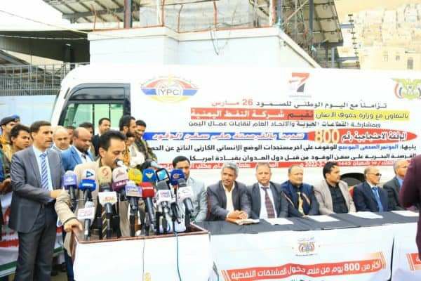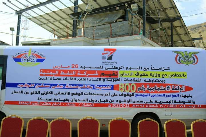 نظّمت وزارة حقوق الإنسان وشركة النفط اليمنية بمشاركة الوزارات الحيوية والخدمية والاتحاد العام لنقابات عمّال اليمن، الثلاثاء، الوقفة الإحتجاجية رقم 800 للتنديد بأعمال القرصنة على سفن الوقود من قِبل تحالف العدوان بقيادة أمريكا، وأكدت أن منع دخول سفن المشتقات النفطية أدى إلى كارثة وزيادة معاناة المدنيين في مختلف المجالات، وشلل تام في مختلف القطاعات.