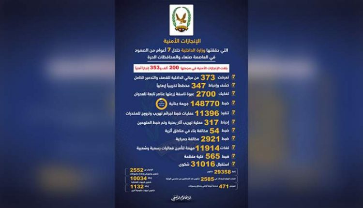 الإنجازات الأمنية بلغت 200 ألف و353 إنجازاً، كما تم إحباط 347 مخططا تخريبيا إرهابياً حرك العدوان عملاءه وخلاياه الإجرامية لتنفيذها في المحافظات الحرة، وتم تفكيك 2700 عبوة ناسفة زرعتها العناصر الإجرامية التابعة للعدوان لاستهداف أمن الوطن وحياة المواطنين، وفقا لإحصائيات وزارة الداخلية خلال سبعة أعوام من الصمود.