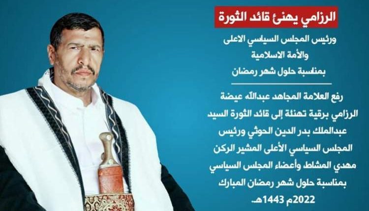 رفع العلامة المجاهد عبدالله عيضة الرزامي برقية تهنئة إلى قائد المسيرة القرآنية السيد عبدالملك بدر الدين الحوثي ورئيس المجلس السياسي الأعلى المشير الركن مهدي المشاط وأعضاء المجلس السياسي بمناسبة حلول شهر رمضان المبارك 2022م 1443هـ.