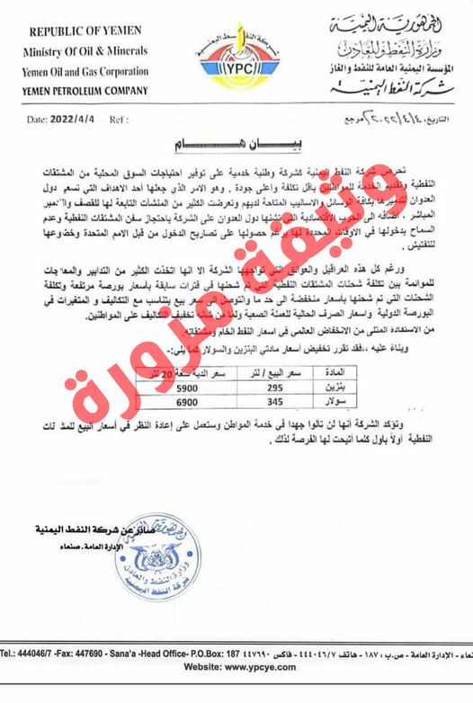 وأرفق المتوكل وثيقة “مزيفة” تداولها نشطاء على مواقع التواصل الاجتماعي على أنها لبيان صادر عن شركة النفط اليمنية في صنعاء حددت فيه أسعار الدبة البنزين سعة 20 لتر بـ 5900 ريال والسولار بـ 6900 ريال، محذّراً من التعاطي معها أو التعامل مع أي مصادر غير رسمية.
