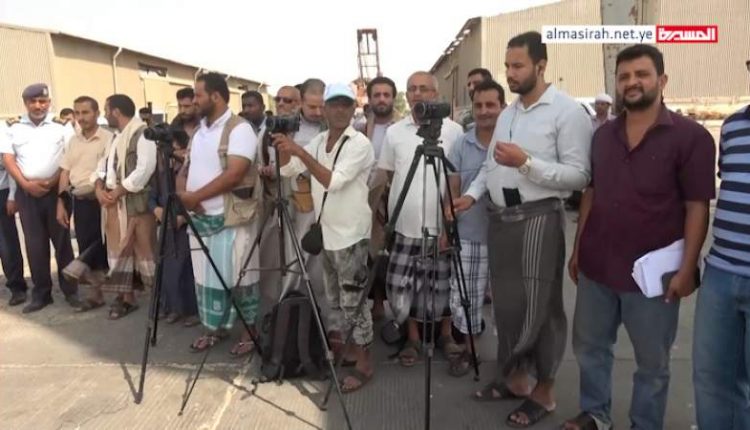 شاهد.. مؤتمر صحفي في ميناء الحديدة لكشف عرقلة العدوان وصول السفن النفطية (فيديو)