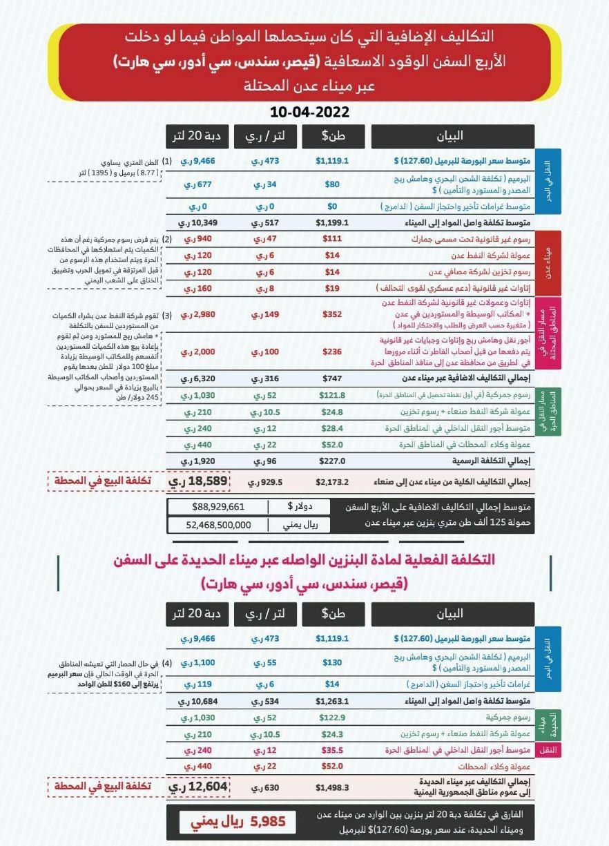 وبين أن الفارق في تكلفة دبة 20 لتر بنزين بين الوارد من ميناء عدن وميناء الحديدة عند سعر بورصة 127.60 دولار للبرميل الواحد، خمسة آلاف و985 ريال.